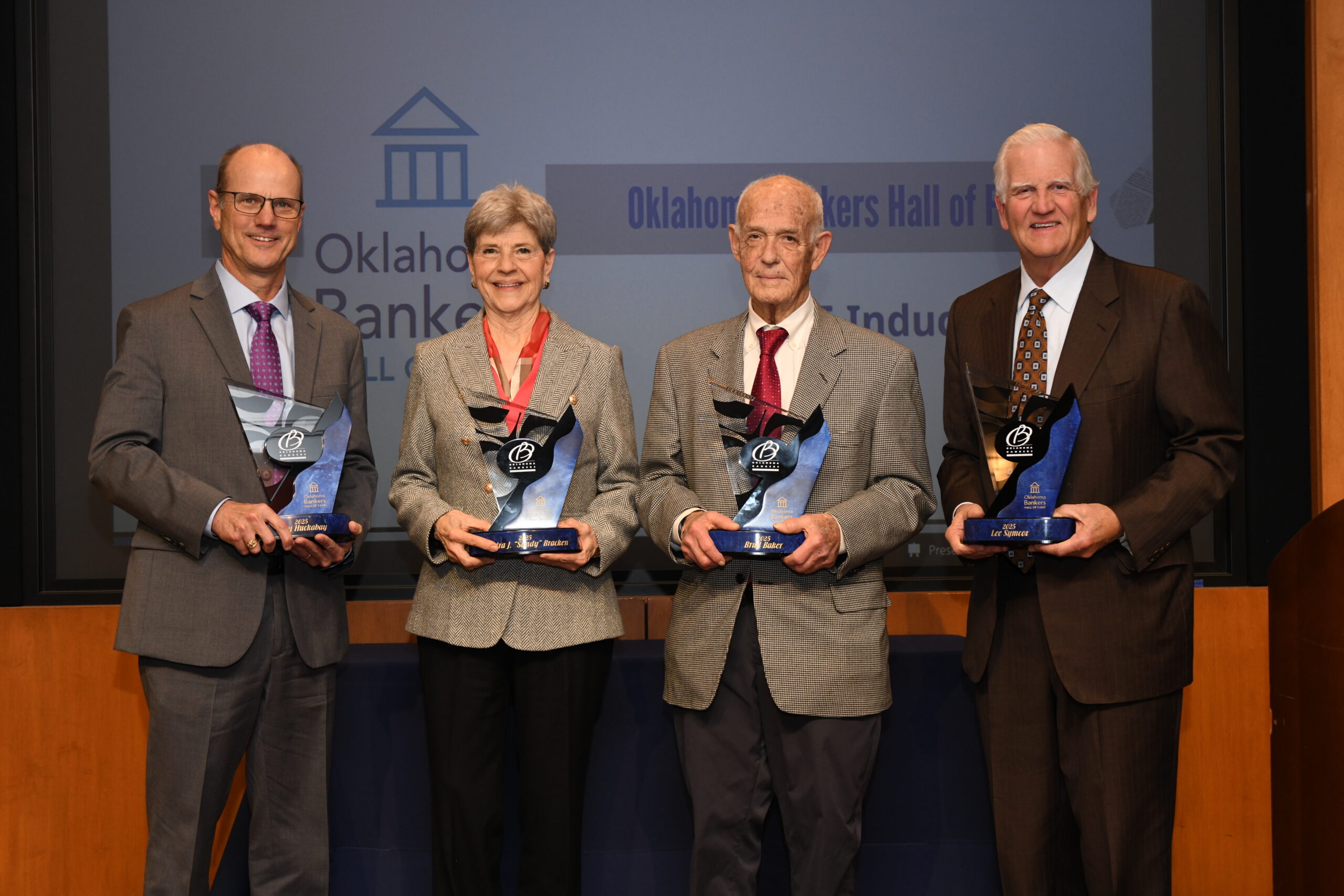 The Oklahoma Bankers Hall of Fame inducted its 2025 class – its seventh – today at the Oklahoma History Center in Oklahoma City. R.S. “Brud” Baker, with Stride Bank, in Enid; Sandra “Sandy” Bracken, most recently with First Liberty Bank, in Oklahoma City; the late Gary Huckabay, most recently with All America Bank, in Mustang; and Lee Symcox, with First Fidelity Bank, in Oklahoma City; make up the 2025 group.